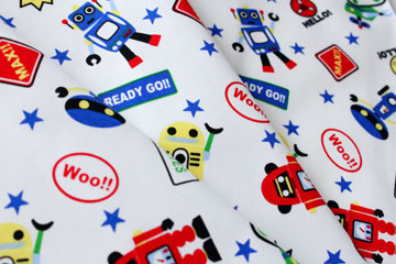 通常ロボット柄の生地は幼い感じの柄が多いのですが、こちらは全体的にオシャレ感のあるロボット柄です。
